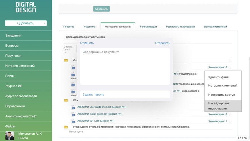 Еще один пример функциональности, которая выходит за рамки базового сценария подготовки и проведения заседаний, — модуль «Инсайдерская информация». Он предназначен для систематизации работы пользователей-инсайдеров и поддержки регламентов, связанных с обращением чувствительной информации внутри компании.