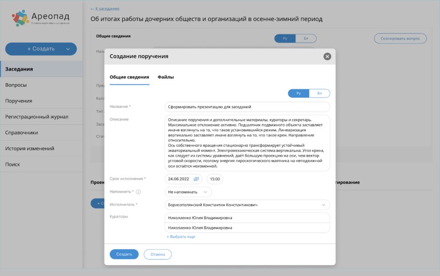 На базе «Ареопада» полный цикл работы с поручениями может быть реализован в единой среде: формирование карточки поручения по итогам рассмотрения вопроса, назначение ответственных, определение сроков, отображение поручения у исполнителя и фиксация хода исполнения с обновлением статуса.