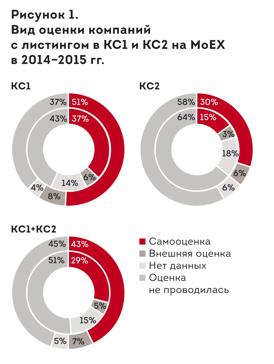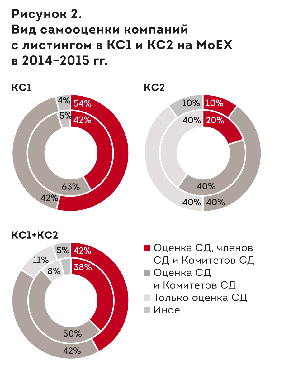 - полноценную самооценку (весь совет директоров, его комитеты, члены совета директоров) в КС1 проводит существенно большая доля компаний, чем в КС2 (42 и 54% против 20 и 10% соответственно);