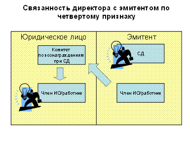 4. Четвертый признак связанности с эмитентом на практике встречается довольно редко. В соответствии с ним связанным с эмитентом признается член совета директоров эмитента, который является членом исполнительных органов и (или) работником юридического лица, вознаграждение которого определяется (рассматривается) комитетом совета директоров по вознаграждениям этого юридического лица, в случае если член исполнительных органов и (или) работник эмитента входит в состав комитета по вознаграждениям указанного юридического лица. Данный признак связанности с эмитентом проиллюстрирован на схеме. Таким образом, чтобы проанализировать наличие связанности члена совета директоров с эмитентом по данному признаку, нужно: