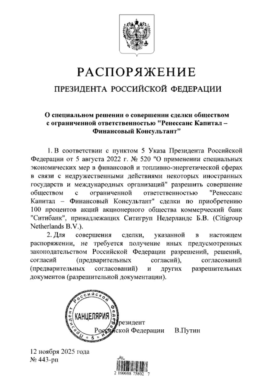 Президент Владимир Путин подписал распоряжение, в соответсвии с которым структуре «Ренессанс капитал — финансовый консультант» разрешено приобрести 100% российского «Ситибанка», который принадлежит «Ситигруп недерландс» (Citigroup Netherlands).
