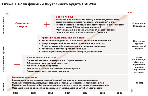 Динамично развивающаяся и постоянно совершенствующаяся функция внутреннего аудита СИБУРа (далее - Внутренний аудит) в период с 2008 года и по настоящее время плодотворно работает не только в роли ревизора", в чьи задачи, среди прочих, входит выявление нарушений в хозяйственной деятельности общества, но и в роли центра компетенций по системе управления рисками и внутреннему контролю (см. схему 1).